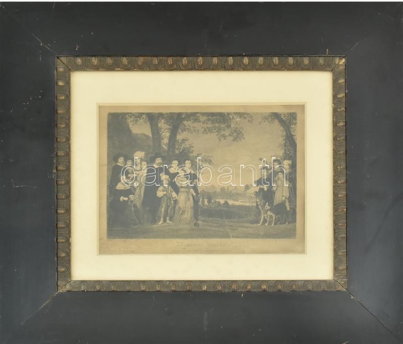 Aelbert Cuyp (1620-1691) után metszette Wilhelm Woernle (1849-1916): Hollandi család, 1880-90 körül. Acélmetszet, papír, jelzett a metszeten. Kiadja az Orsz. Magy. Képzőművészeti Társulat. Kissé sérült, foltos, kopott. Üvegezett, dekoratív, régi, kissé sérült fa keretben. 12,5x18 cm.