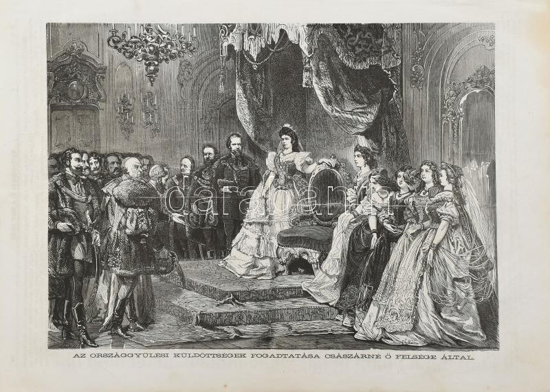 cca 1866 Erzsébet királyné fogadja az országgyűlés küldöttségét, (Az országgyűlési küldöttségek fogadtatása császárné ő felsége által), In: Magyarország és a Nagyvilág 1866. 10. sz., 1866. január, fametszet, 23x32 cm