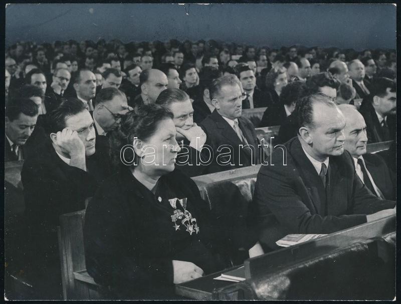 Leírás: 1959 Bp., az MSZMP VII. kongresszusa a MÉMOSZ székházban, a résztvevők közt egy hölgy több magas rendű kitüntetéssel, feliratozott MTI fotó, 12x9 cm