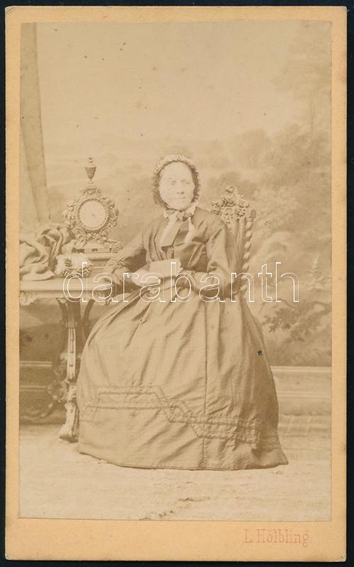 Leírás: cca 1870 Idős hölgy portréja, keményhátú fotó Hölbling bécsi műterméből, 10×6 cm