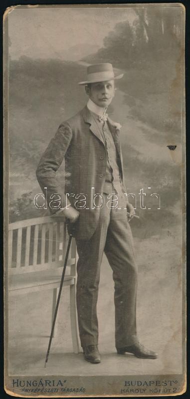 Leírás: cca 1910 Férfi kalapban cigarettával, keményhátú fotó Hungária budapesti műteremből, foltos, sarkai kopottak, 21×10 cm