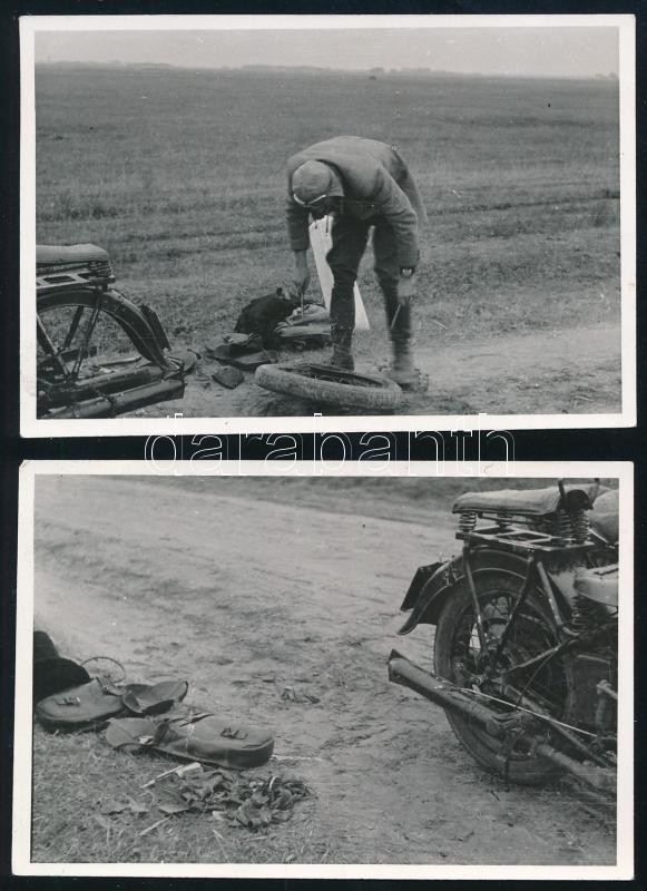 cca 1935 2 db fotó motorkerékpáros defektszerelésről, 7×9,5 cm https://www.darabanth.com/hu/410-Gyorsarveres/410.0/Fotomuveszet/Foto~500022/cca-1935-2-db-foto-motorkerekparos-defektszerelesrol-7C3979-5-cm~II2550156