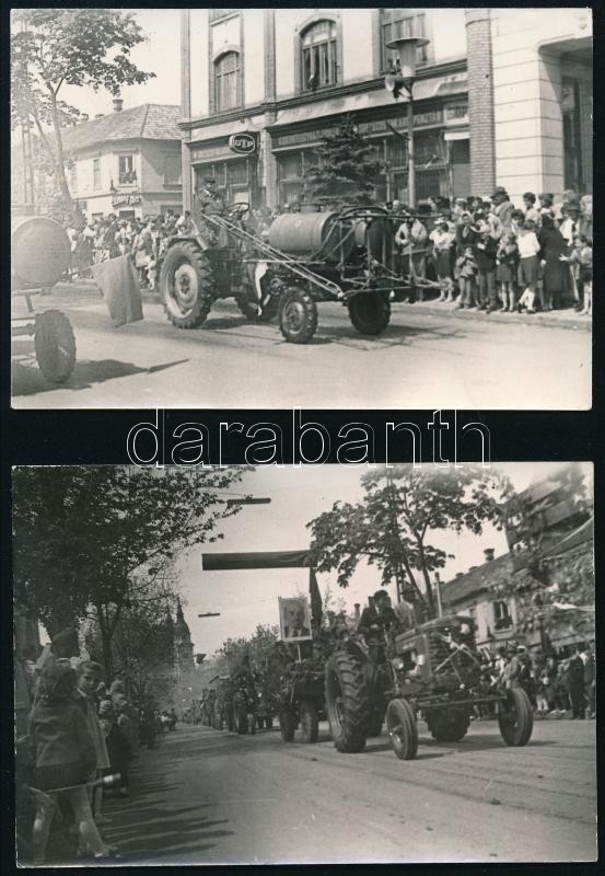 Leírás: cca 1950-1960 Kiskunfélegyháza, felvonulás traktorokkal, 2 db fotó, 6,5×9,5 cm