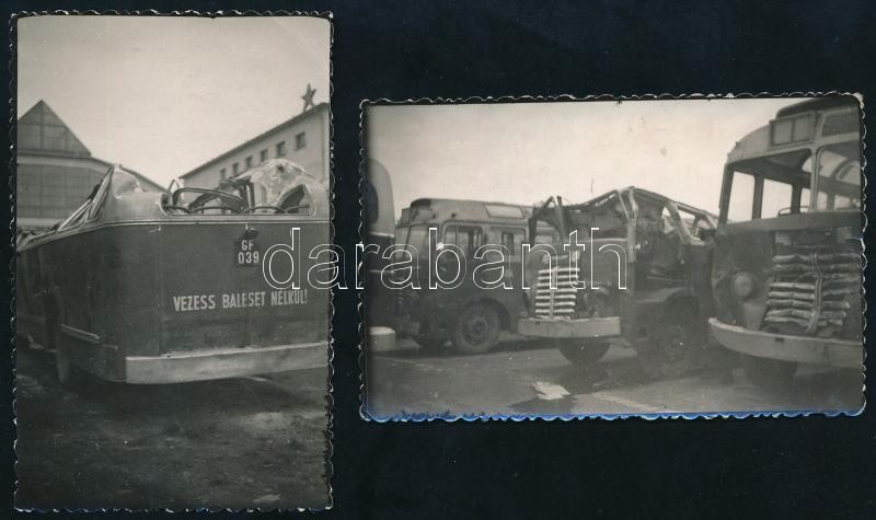 Leírás: cca 1960 2 db fotó összetört városi Ikarus buszokról, 9×5,5 cm