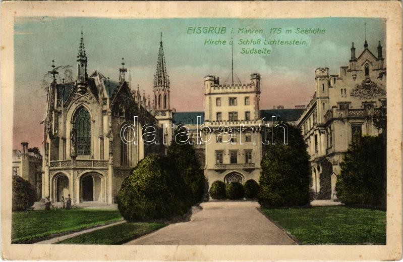 Leírás: 1914 Lednice, Lednice-Valtice, Feldsberg-Eisgrub, Eisgrub; Kirche und Schloß Liechtenstein (Südseite) / castle, church (fl)