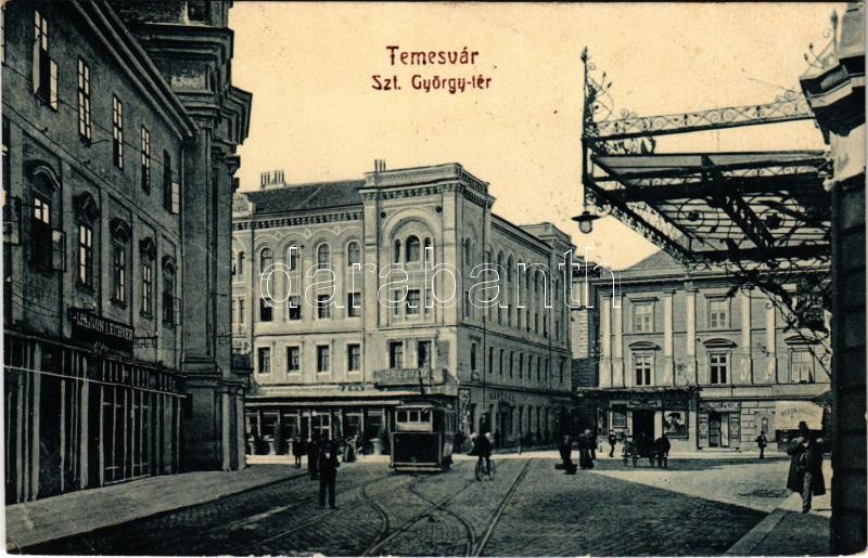 1909 Temesvár, Timisoara; Szt. György tér, villamos, Maison Lechner, Gresham Kávéház, Klein Hillel, Farber Miksa és Szeibert Péter üzlete. W.L. Bp. 2020. Gerő Manó kiadása / square, tram, shops, cafe
