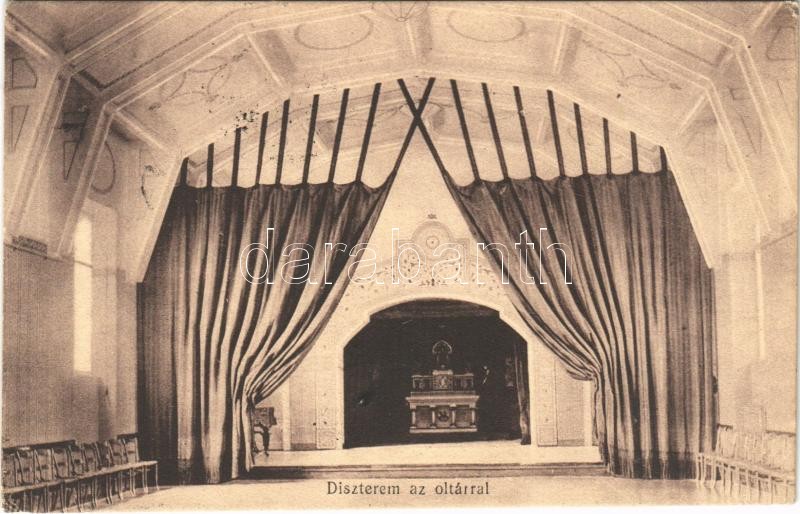 1914 Kolozsvár, Cluj; Miasszonyunkról nevezett szegény iskolanővérek vezetése alatt álló Marianum római katolikus tan- és nevelőintézet, díszterem az oltárral, belső / Catholic boarding school, altar, interior (EK)