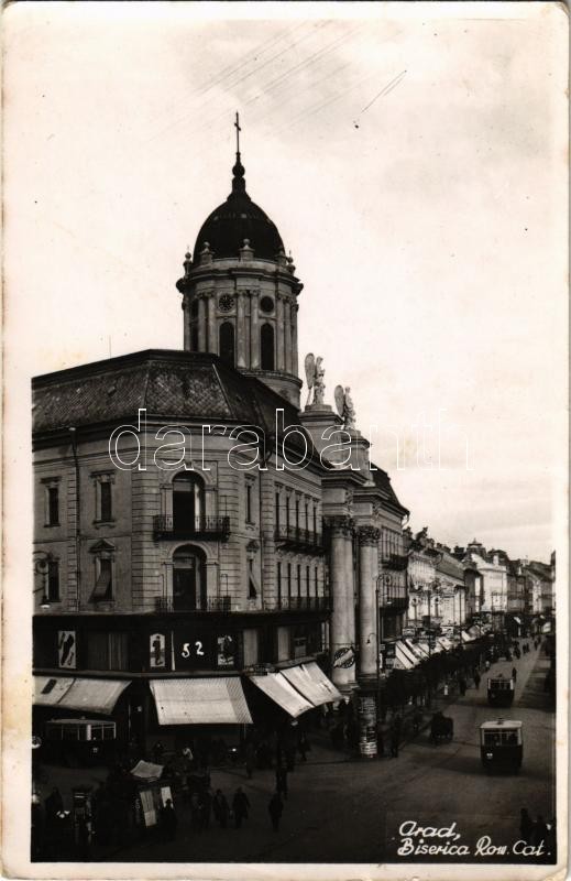 Arad, Római katolikus templom, villamos, Serilana J.A. üzlete / Biseri... https://www.darabanth.com/hu/410-Gyorsarveres/410.0/Kepeslapok/Erdely~1500006/Arad-Romai-katolikus-templom-villamos-Serilana-JA-uzlete-Biserica-rom-cat-church-stree~II2550313