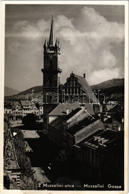 Beszterce, Bistritz, Bistrita; Mussolini utca, Evangélikus templom / s... https://www.darabanth.com/hu/410-Gyorsarveres/410.0/Kepeslapok/Erdely~1500006/Beszterce-Bistritz-Bistrita-Mussolini-utca-Evangelikus-templom-street-view-Lutheran-church-~II2544109