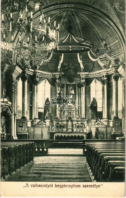 Leírás: Csíksomlyó, Sumuleu Ciuc; Kegytemplom szentélye, belső. Kiadja Gust és Puskás fényképészete / Maria miraculoasa / pilgrimage church, interior (EK)