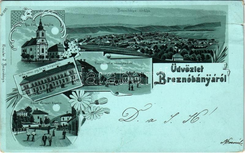 1898 (Vorläufer) Breznóbánya, Brezno nad Hronom; Római katolikus templom, Piac tér és városháza, Szent Kereszt kápolna, M. kir. állami polgári fiú és leányiskola, este. Kreisler J. kiadása / church, square, town hall, school, chapel. Art Nouveau, floral, litho (szakadás / tear)