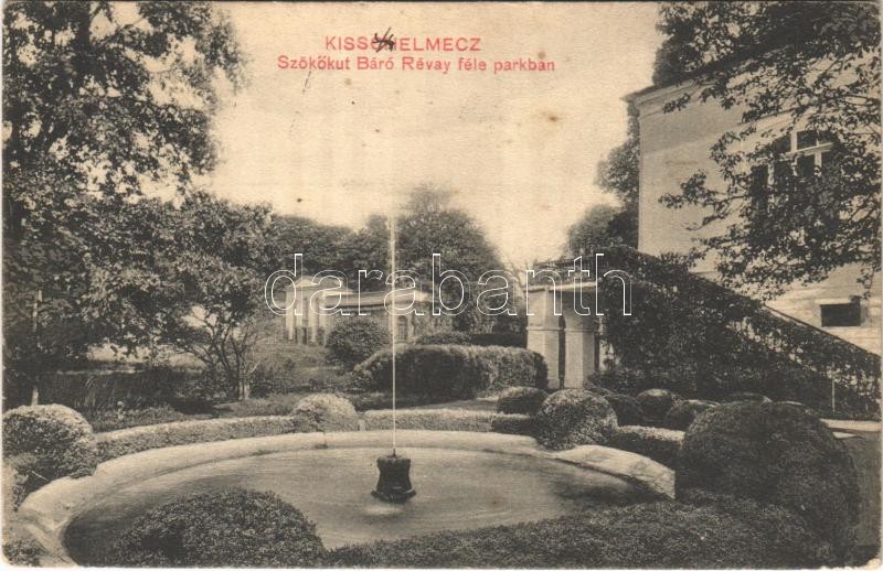 Leírás: 1910 Kisselmec, Liptókisselmec, Sztiavnicska, Stiavnicka (Rutóc); szökőkút a Báró Révay kastély parkban / castle park, fountain (EK)