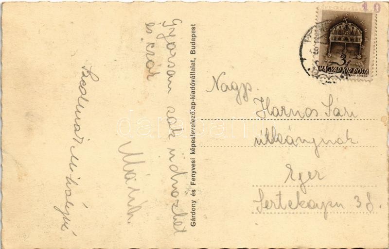 1943 Beregszász, Berehove, Berehovo; látkép, utca, Kir. Törvényszék, Római katolikus templom / general view, street view, court, Catholic church (ázott sarok / wet corner)
