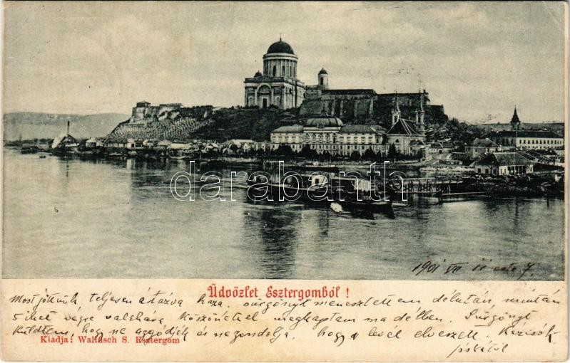 Leírás: 1901 Esztergom, a vártemplom és a prímási palota a dunai oldalról, hajóállomás. Wallfisch S. kiadása (EK)