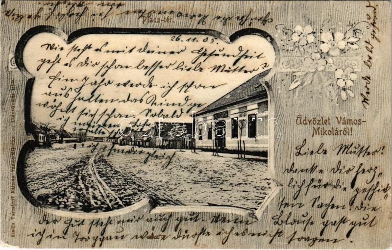 Leírás: 1905 Vámosmikola, Vámos-Mikola; Piactér, Gyógyszertár télen. Turcsányi Kálmán kiadása. Floral (EM)