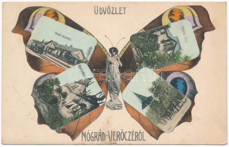 Leírás: 1911 Verőce, Nógrádverőce, Nógrád-Verőcze; Vasútállomás, gőzmozdony, Madari villa, Svadlo villa, nyaraló. Vavrik Géza kiadása. Szecessziós pillangós hölgy montázs művészlap / Art Nouveau butterfly lady montage art postcard (fl)