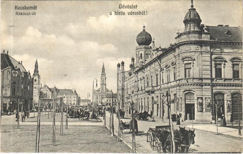 Leírás: 1912 Kecskemét, Rákóczi út, piac, zsinagóga, Deutsch József üzlete, bélyegáruda. G. Fekete Mihály kiadása (EK)