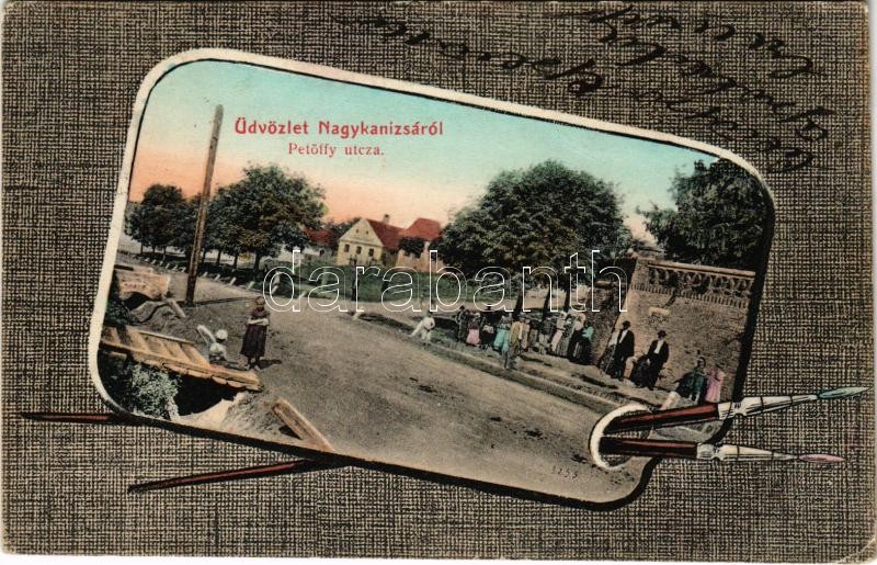 Leírás: 1913 Nagykanizsa, Petőffy utca. Szecessziós montázs, Schless A. utóda kiadása (EK)