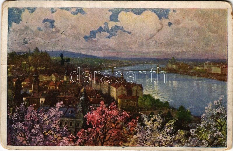 Leírás: 1918 Budapest I. Királyi vár a Gellért-hegyről nézve, Tabán, Döbrentei tér, Lánchíd. Művészlevelezőlap Hausner H. 7014/2. (EM)