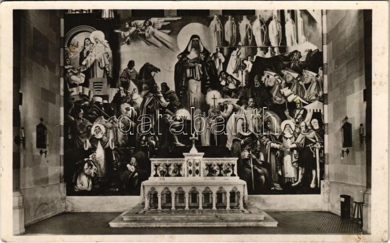 Leírás: 1944 Budapest XIV. A Szent Domonkos-rend (Rózsafüzér Királynéja) temploma, Árpádházi B. Margit márványoltára és freskója. Festette Kontuly Béla (fa)