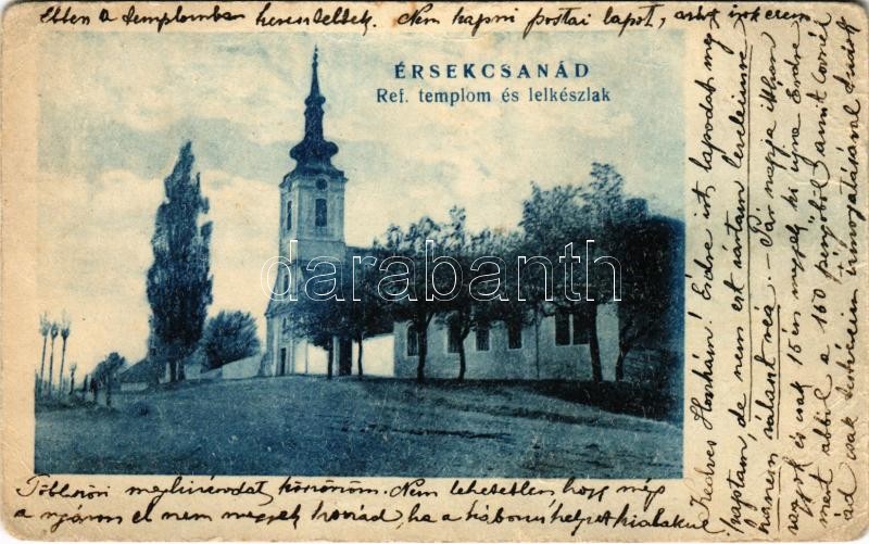 Leírás: 1944 Érsekcsanád, Református templom és lelkészlak. Hangya szövetkezet kiadása (EB)