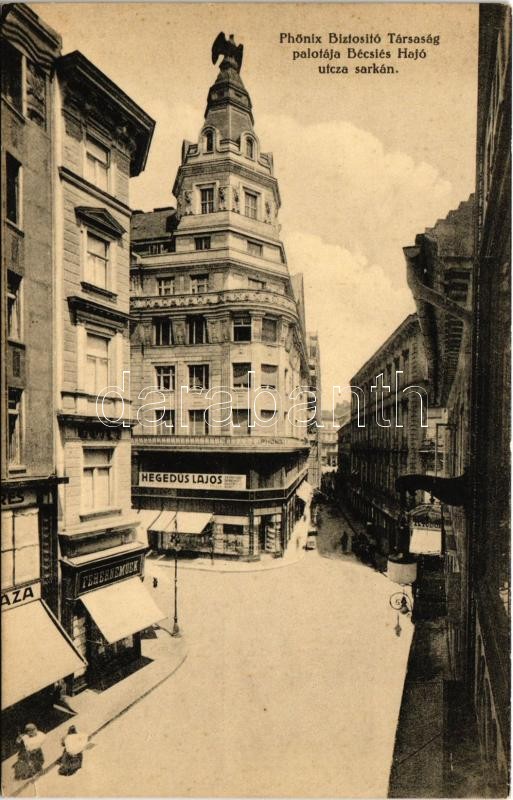 Leírás: Budapest V. Phönix Biztosító Társaság palotája a Bécsi és Hajó utca sarkán, Kertész Tódor és Hegedűs Lajos üzlete, fehérneműk