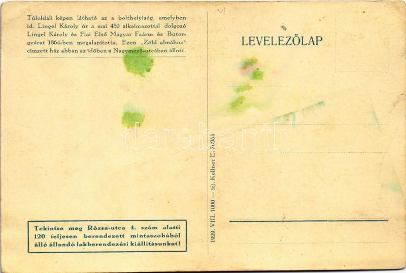 Budapest VI. A mai 450 alkalmazottal dolgozó Lingel bútorgyár alapítási helye 65 esztendővel ezelőtt a Nagymező utcában a Zöldalmához címzett házban (EK)