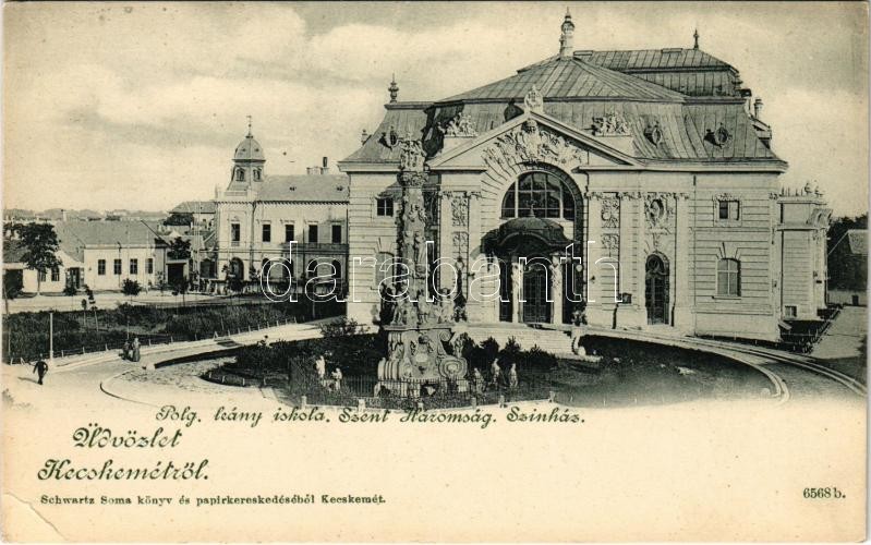 Leírás: Kecskemét, Polgári leány iskola, Szentháromság szobor, színház (EK)
