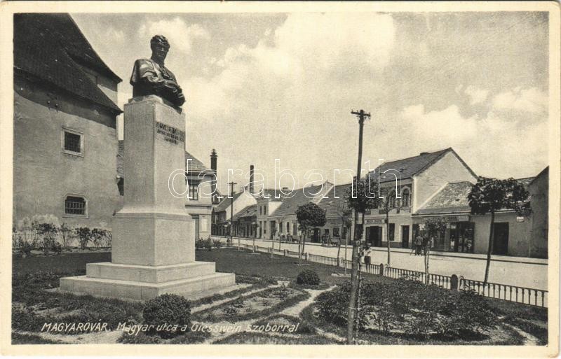 Leírás: Magyaróvár, Mosonmagyaróvár; Magyar utca, Giesswein Sándor szobra, üzletek. Ács Istvánné kiadása (EK)