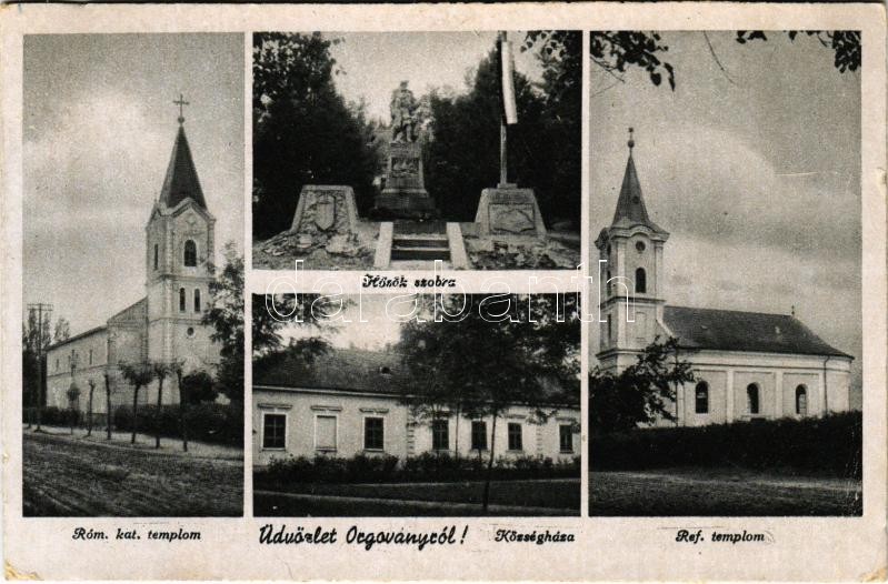 Leírás: Orgovány, Hősök szobra, emlékmű, Országzászló, Római katolikus templom, Községháza, Református templom (EK)