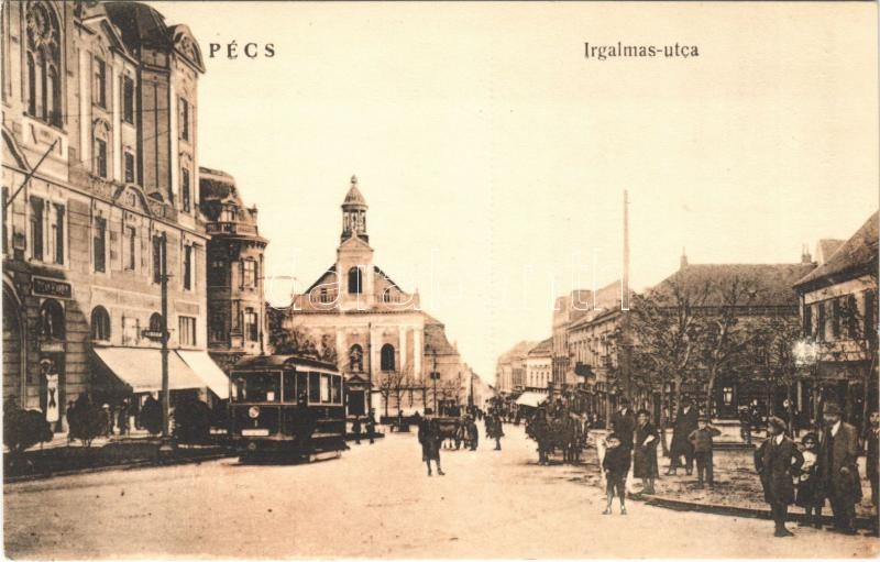 Pécs, Irgalmas utca, villamos, üzletek. Nagy és Vörösvatzky kiadása https://www.darabanth.com/hu/410-Gyorsarveres/410.0/Kepeslapok/Magyarorszag~1500005/Pecs-Irgalmas-utca-villamos-uzletek-Nagy-es-Vorosvatzky-kiadasa~II2304949