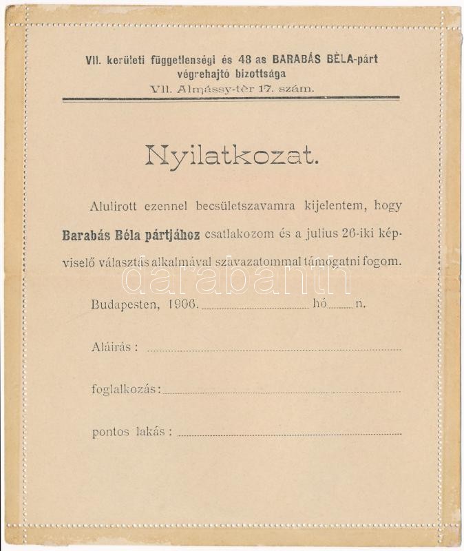 Leírás: 1906 Zárt Levelezőlap a VII. ker. függetlenségi és 48-as Barabás Béla pártnak. Budapest, Almássy tér 17. Csatlakozási nyilatkozat