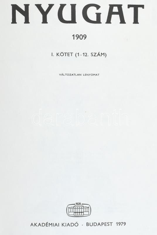 Nyugat 1909. I-II. köt. (1-12., 13-24. sz.). Bp., 1979-1980, Akadémiai... https://www.darabanth.com/hu/410-Gyorsarveres/410.0/Konyvek/Konyvek-Egyeb-ritkasagok~1000024/Nyugat-1909-I-II-kot-1-12-13-24-sz-Bp-1979-1980-Akademiai-Kiado-666plus2-p-720plus2~II2544755