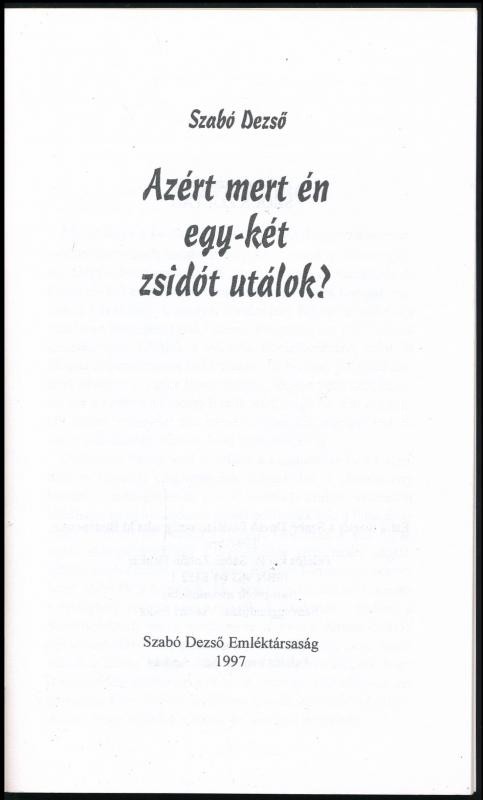 Leírás: Szabó Dezső: Azért mert én egy-két zsidót utálok? Szerk.: Szőcs Zoltán. Bp., 1997, Szabó Dezső Emléktársaság. Kiadói tűzött papírkötés.