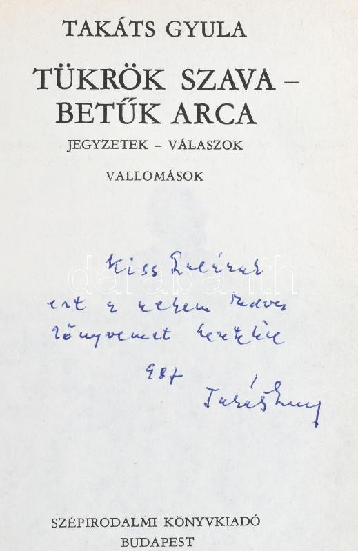 Takáts Gyula: Tükrök szava - betűk arca. Jegyzetek - válaszok. Vallomások. Bp.,1985,Szépirodalom. Első kiadás. Kiadói egészvászon-kötés, kiadói papír védőborítóban.