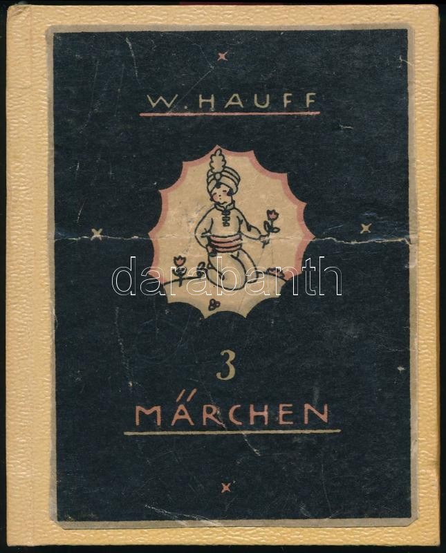 Wilhelm Hauff: Drei Märchen. Mit 16 Originallithographien und Buchschmuck von Fritzi Löw. Wien, én.,Anton Schroll&Co., 241+1 p. + 16 (színes litográfiák) t. Német nyelven. Friederike ,,Fritzi" Löw (1892 -1975 ) illusztrátor, grafikus, Wiener Werkstätte tag 16 színes litográfiájával. Átkötött egészvászon-kötés, az elülső táblán az eredeti illusztrált papírborítóval, egy lap szakadt.