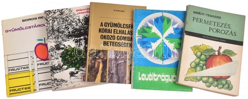 Leírás: Vegyes kertészeti könyv tétel,5 db: Erdélyi-Tengerdi: Permetezés, porozás; Vajna László: A gyümölcsfák korai elhalását okozó gombás betegségek; Levéltrágyázás. Szerk.: Pecznik János; Debreczeny Zsolt-Csapody Vera: Télen is zöld kertek.; Boros Rezső: Gyümölcstárolás. Bp., 1962-1983, Mezőgazdasági. Kiadói papírkötések, változó állapotban.