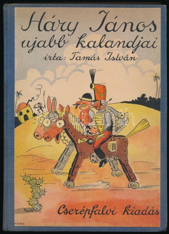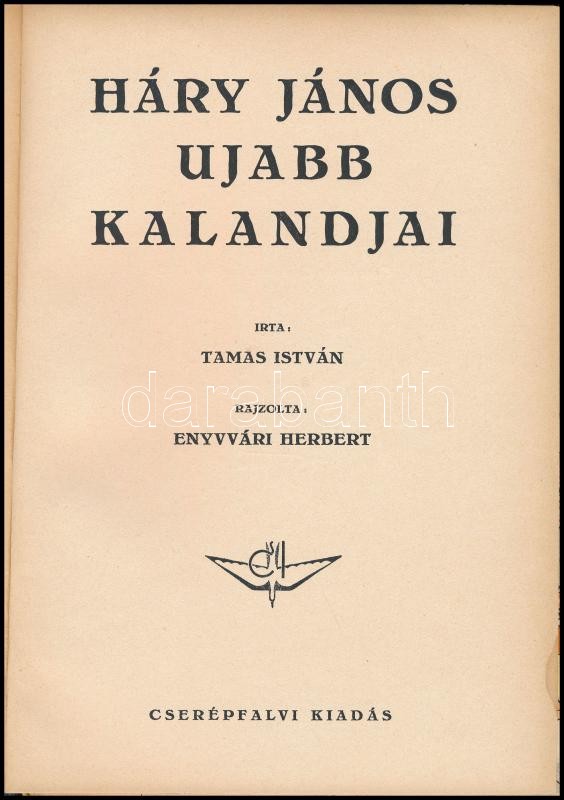 Tamás István: Háry János ujabb kalandjai. Rajzolta: Enyvári Herbert. Bp., 1935, Cserépfalvi,(Egyesült Nyomda Rt-ny.), 29+2+30-56+1 p. + 11 (színes képtáblák) t. Első kiadás. Szövegközti fekete-fehér illusztrációkkal. Kiadói illusztrált egészvászon-kötés, egészen kis kopásnyomokkal a borítón, a lapéleken folttal, jó állapotban.