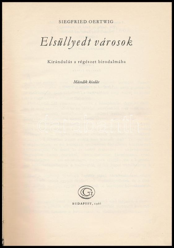 Leírás: Siegfired Oertwig: Elsüllyedt városok. Kirándulás a régészet birodalmába. Ford.: Borzsák Isván. Bp., 1966, Gondolat. Második kiadás. Kiadói félvászon-kötés,
