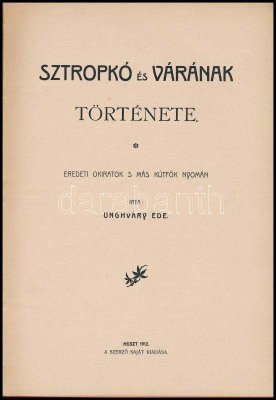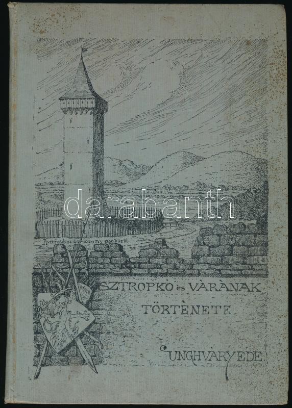 Unghváry Ede: Sztropkó és várának története. Huszt, 1912, szerzői. Kiadói illusztrált egészvászon kötésben, kopott borítóval, festett lapélekkel, két lap ragasztószalaggal javított. Két kihajtható melléklettel, amelyek közül a sztropkai kazula sérült és hiányos, ragasztószalaggal javított.