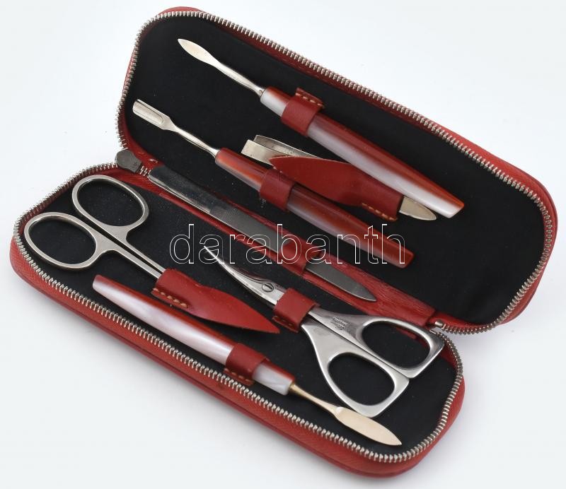 Leírás: 7 db-os manikűr készlet, piros műbőr tokban, 17x6 cm