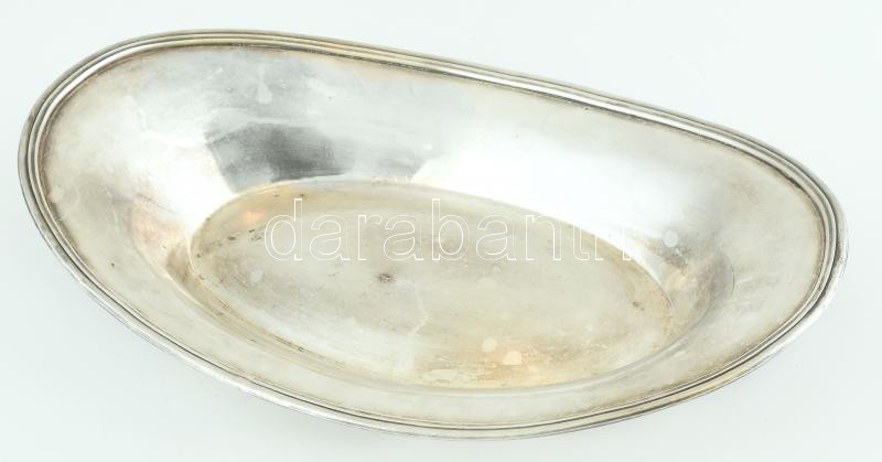 Leírás: Ezüstözött alpakka tál, jelzés nélkül, kopásnyomokkal, kisebb horpadással, 30x19 cm
