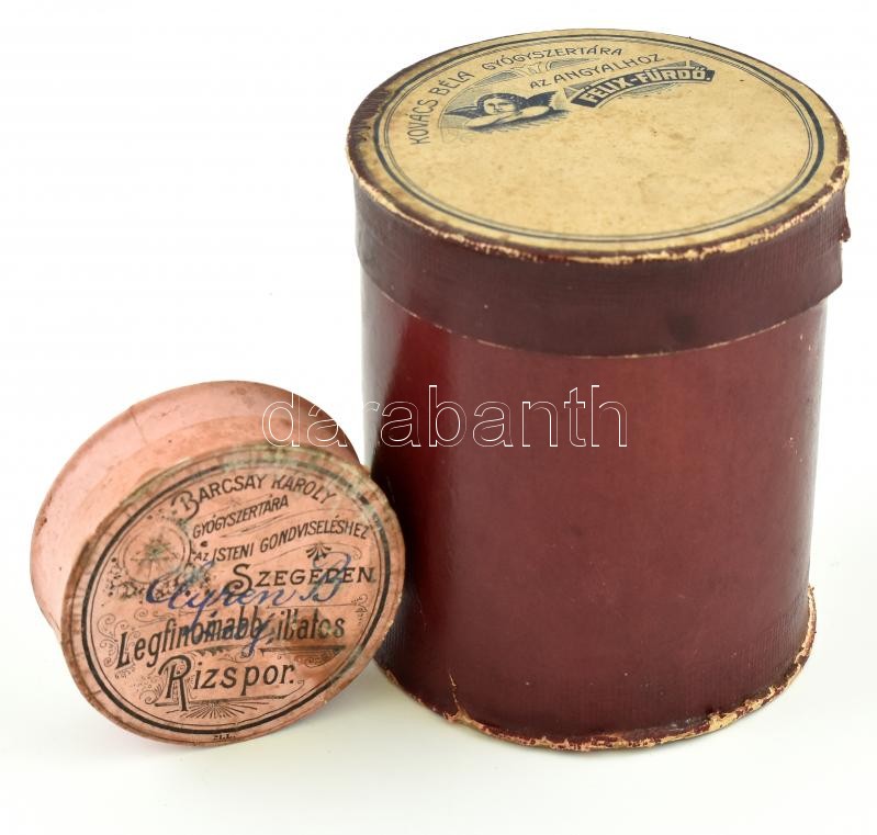 Leírás: Gyógyszerész kartondoboz, 2 db, Kovács Béla gyógyszrtára, az angyalhoz, Félix-fűrdó - Barcsay Károly Szegeden, Rizspor., kopott, sérült. m:2 és 9,5cm