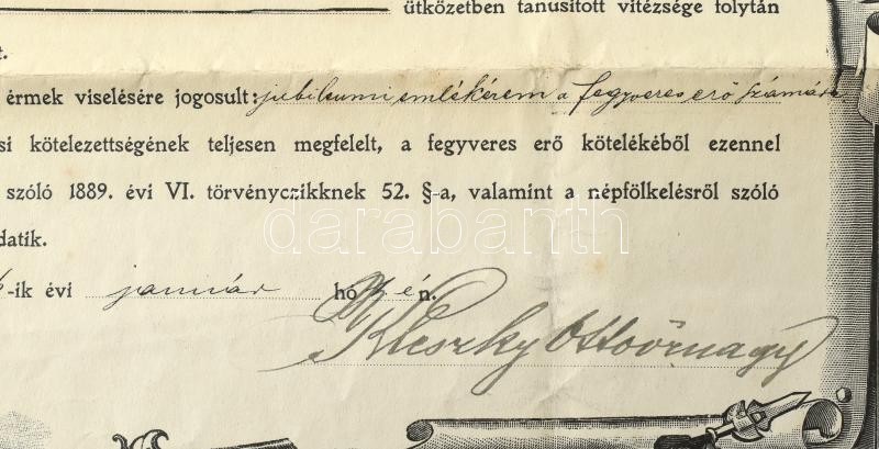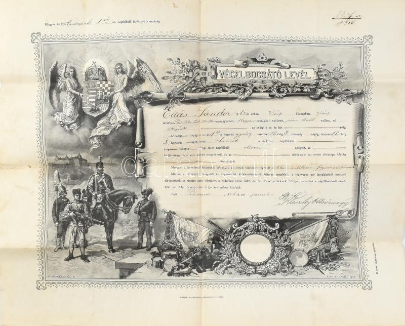 Leírás: 1906 I. honv. gyalogezred végelbocsájtó levél obsit, jó állapotban 55x44 cm