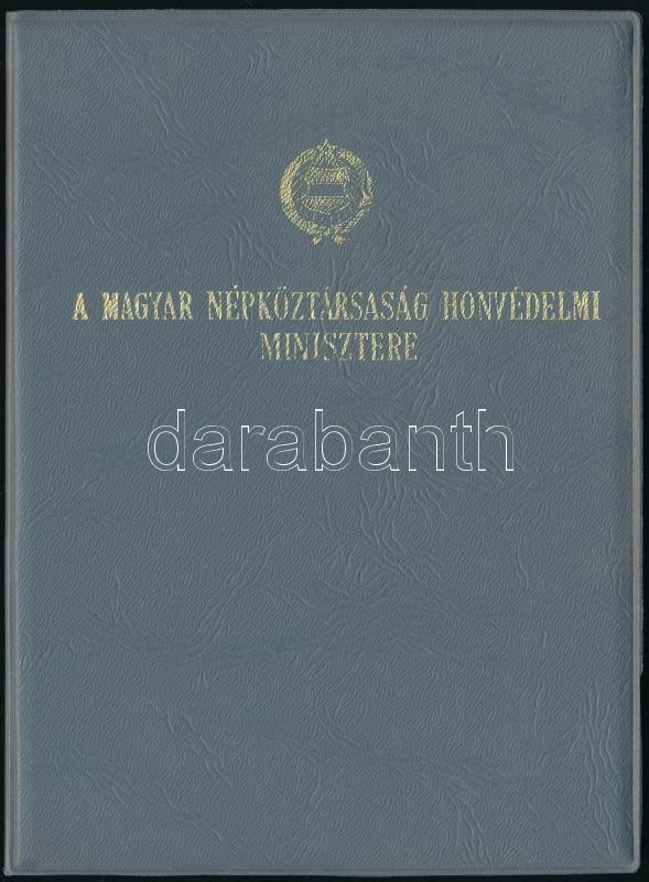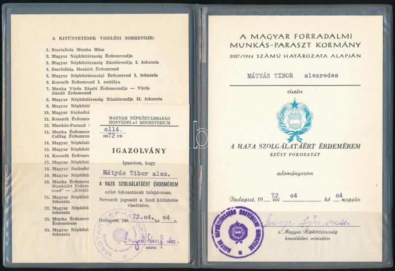 1972 Bp., A Haza Szolgálatáért Érdemérem ezüst fokozatának adományozó oklevele Mátyás Tibor alezredes részére, rajta Czinege Lajos (1924-1998) honvédelmi miniszter saját kezű aláírásával, eredeti tokjában + az érdemérem viselésére jogosító igazolvány