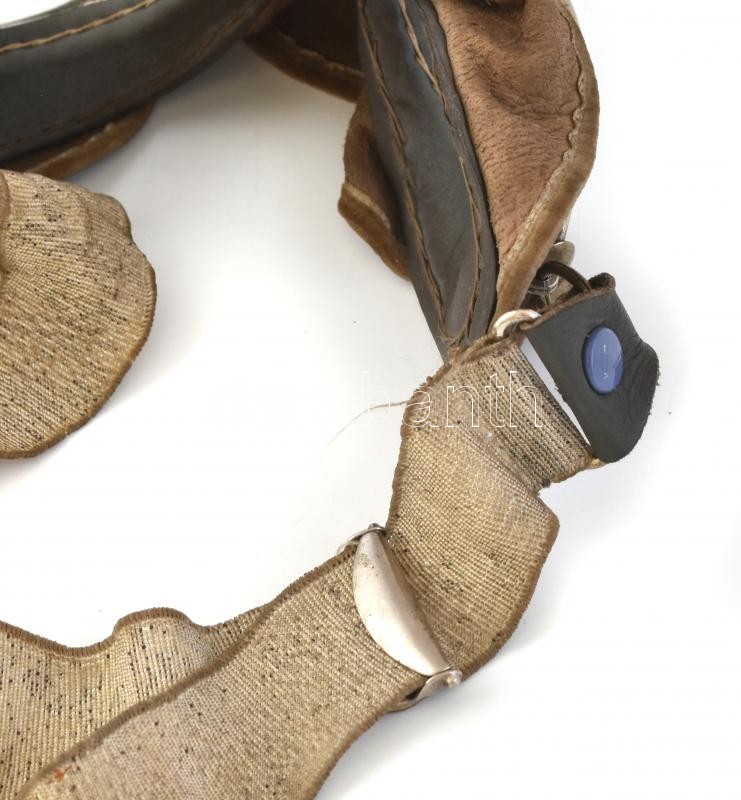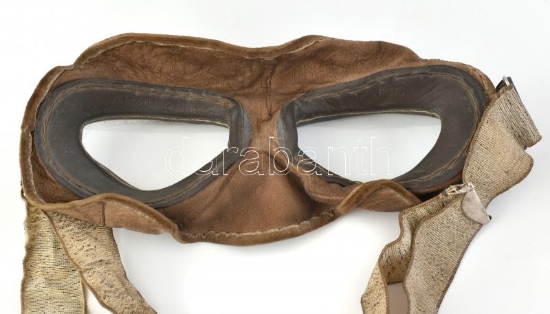 II. világháborús pilóta szemüveg dobozával, tartalék lencsével. Emblémával jelzett, szellőzőnyílással. Fém, bőr, gumi. Jó állapotban / World War II. pilot's aviator goggles, glasses with original box and extra lens.