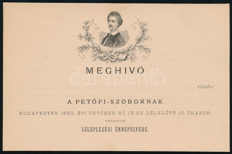 1882 Budapest, meghívó a Petőfi-szobor leleplezési ünnepélyére, kitölt... https://www.darabanth.com/hu/410-Gyorsarveres/410.0/Mutargy-papirregiseg-egyeb/Nyomtatvanyok~1000003/1882-Budapest-meghivo-a-Petofi-szobor-leleplezesi-unnepelyere-kitoltetlen~II2548129