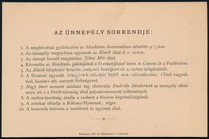 Leírás: 1882 Budapest, meghívó a Petőfi-szobor leleplezési ünnepélyére, kitöltetlen