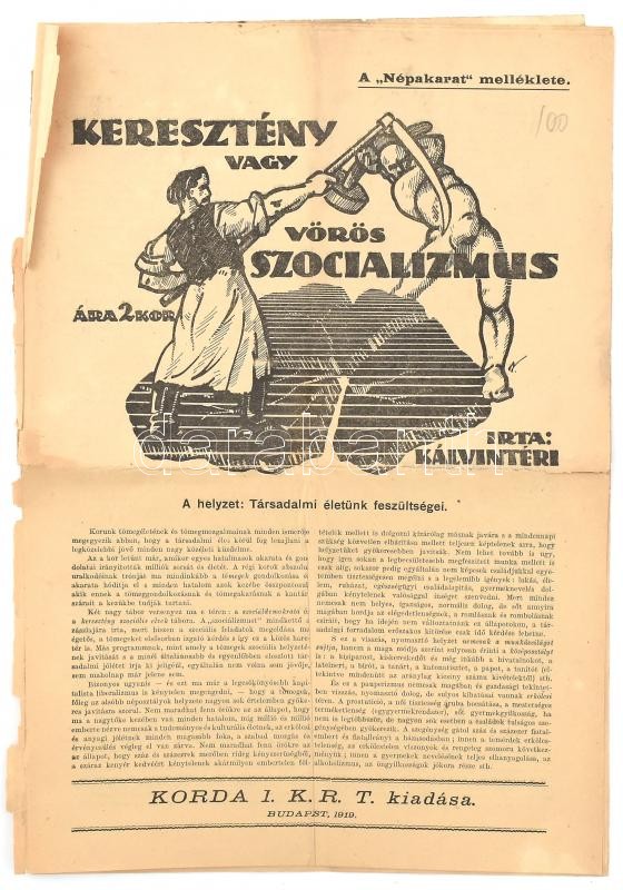 1919 Kálvintéri (Bangha Béla): Keresztény vagy vörös szocializmus. A "Népakarat" melléklete. Bp., 1919, Korda Rt. kiadása. 11p. Sérült, hajtott. 42,5x29,5 cm.