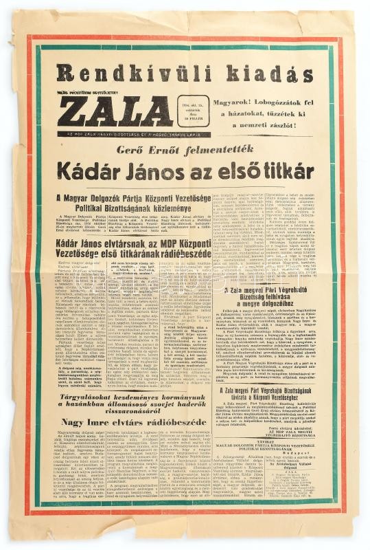 1956.X.25 Zala, az MDP Zala megyei bizottsága és a megyei tanács lapjának rendkívüli kiadása a forradalom híreivel, 1 oldal, lapszéli szakadásokkal, 47,5x31 cm